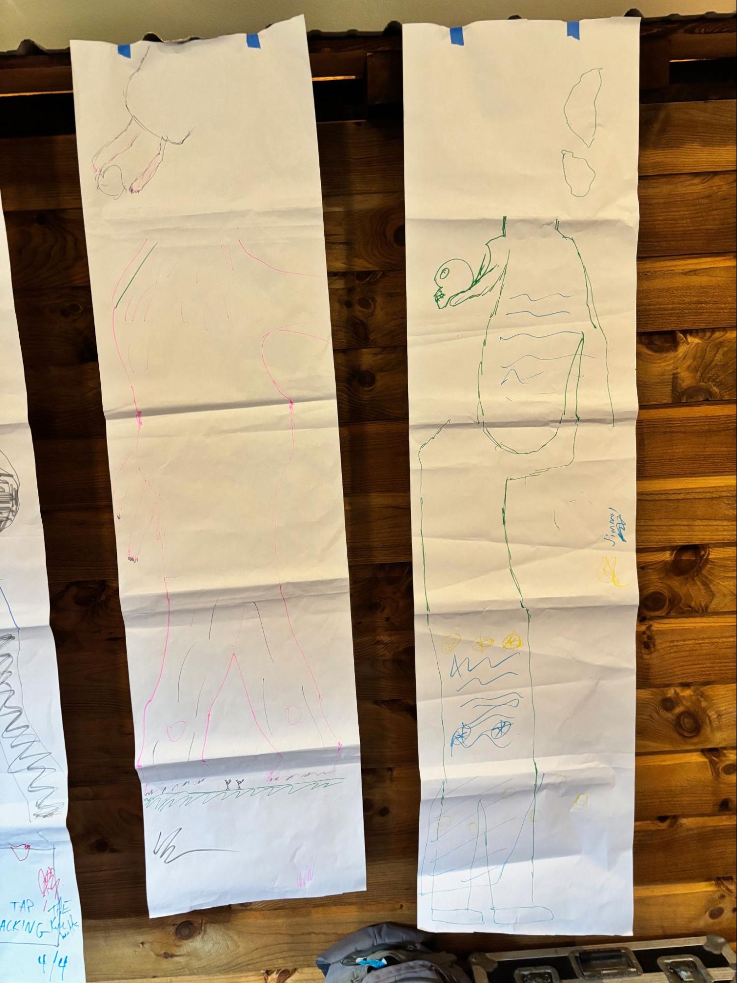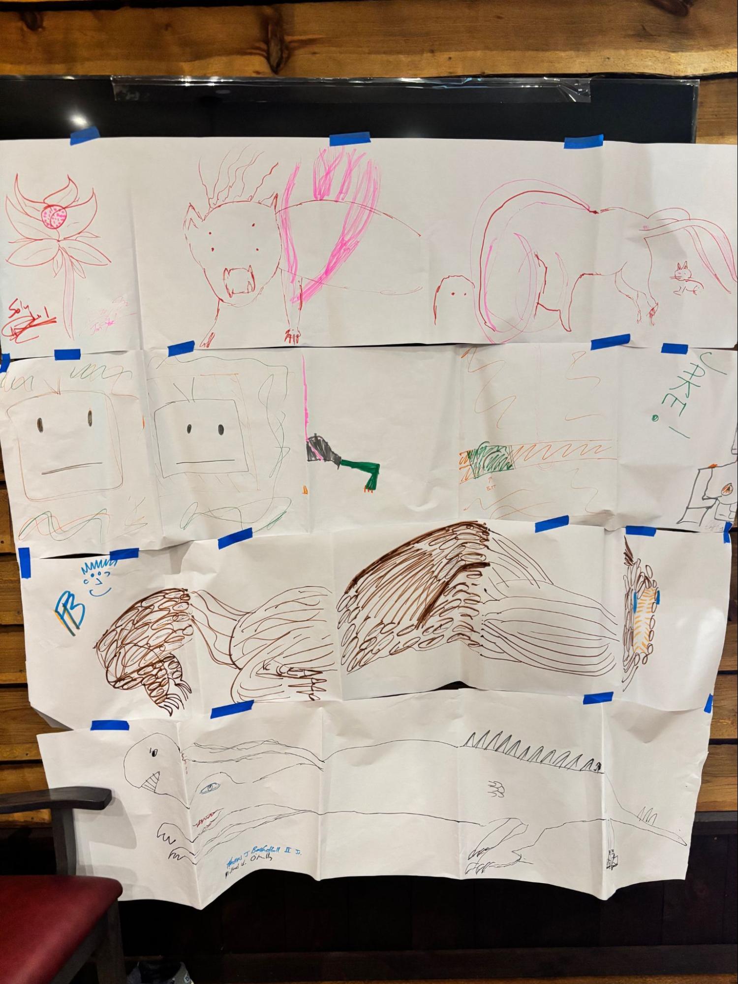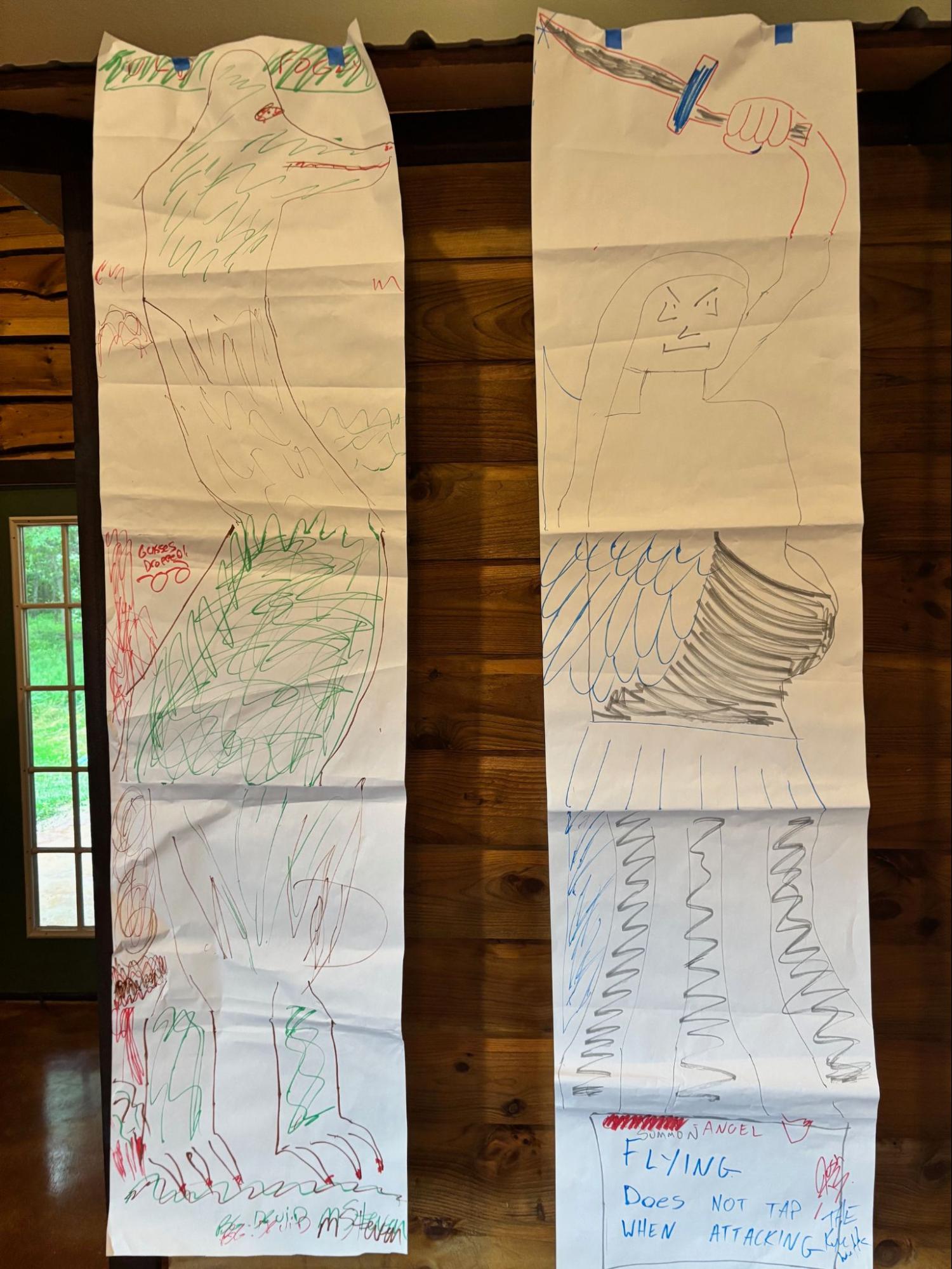 I used big rolls of easel paper pre-folded into fifths, and except for doing this outside on the grilling patio where it was windy, this went great—very fun watching things come together, or absolutely fail to. Time was meant to be limiting, but not a hindrance. Some drawings (or at least sections of drawings) even had some real artistry to them. There were accent lines and colors, crosshatching… consummate V’s! Other drawings completely omitted heads, or had extras—as hoped. When everyone was done, we hung the drawings in the tournament hall for everyone to see and enjoy.