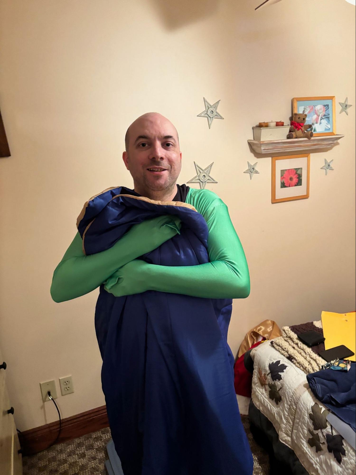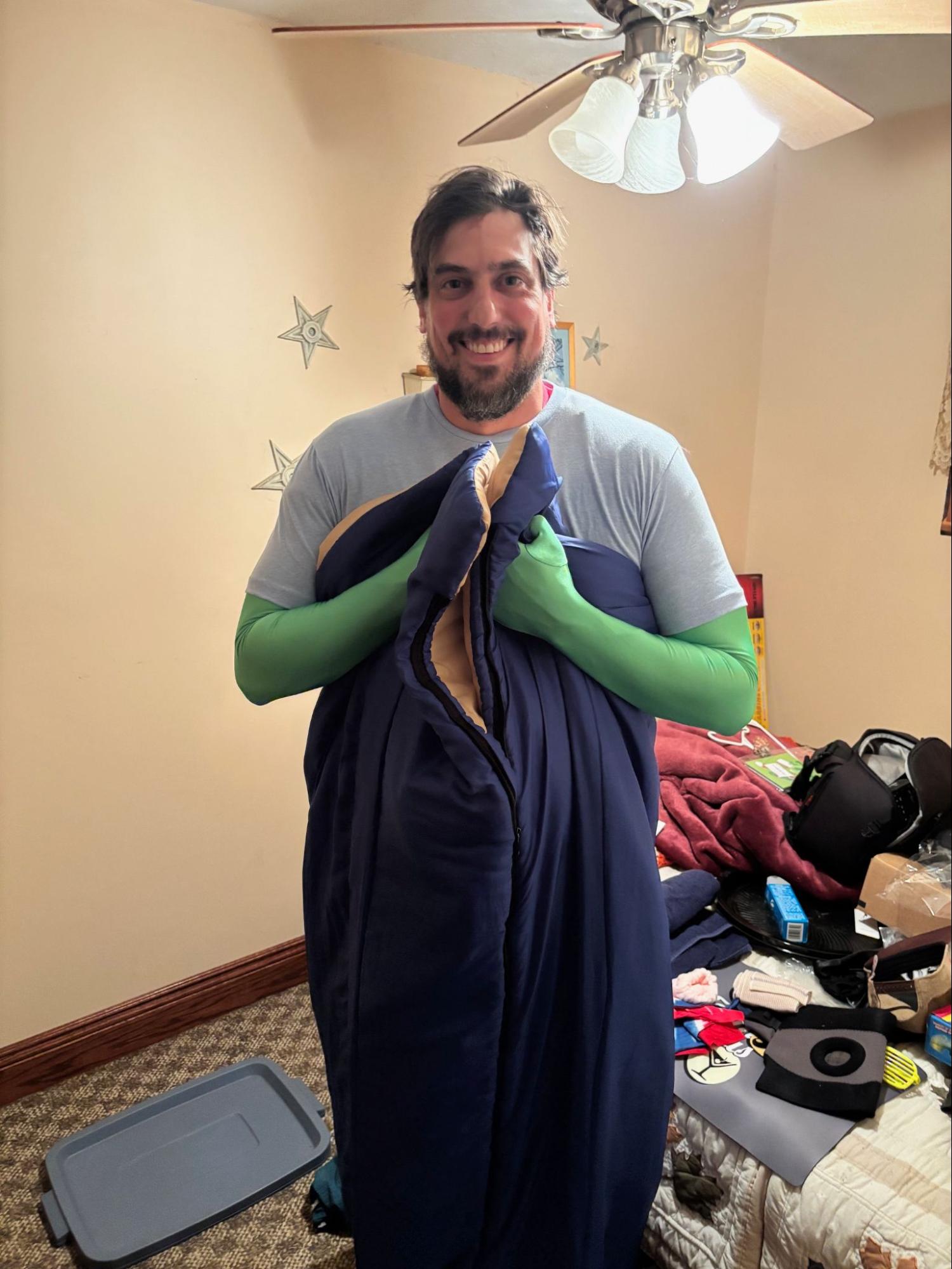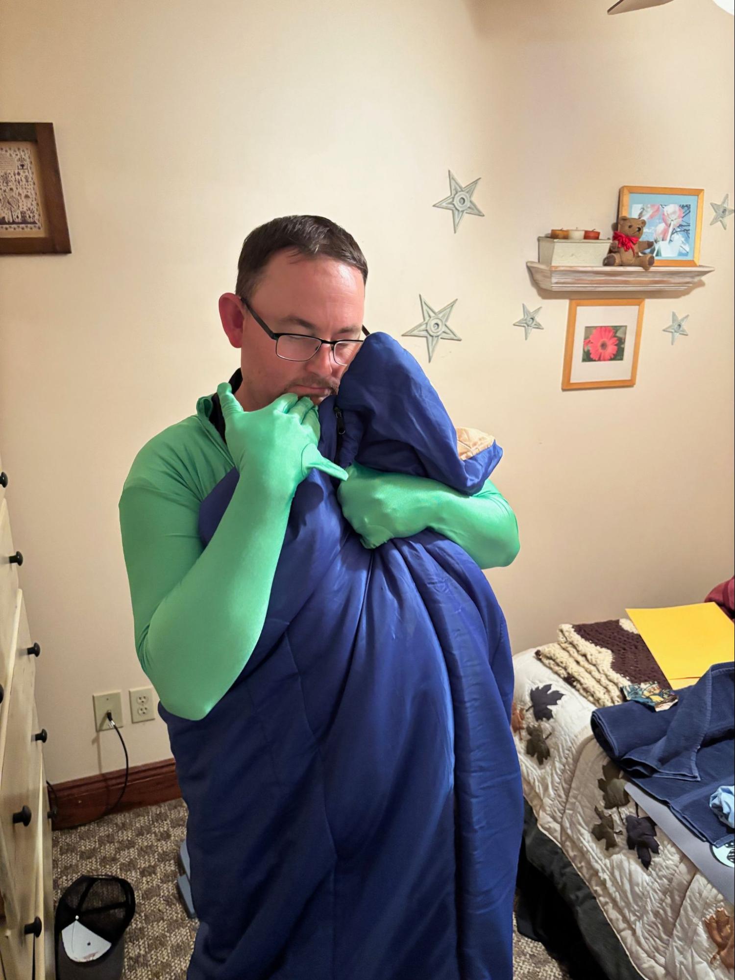 Triple sleeve yourself. First put on the green morph suit. Then cover your least favorite bone or bones (declared on the sign-up form) with an appropriate clothing item or accessory from the bin. Then get fully into the sleeping bag and stand up. Fastest time wins.